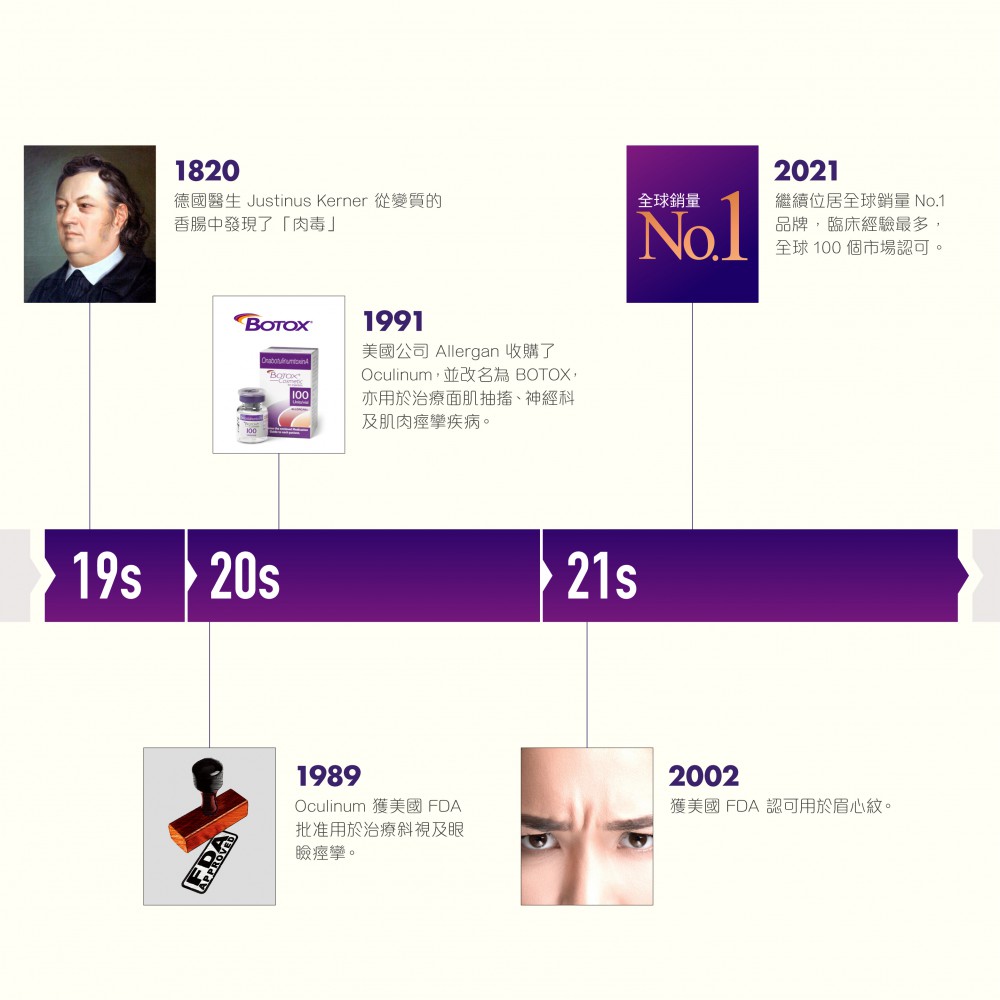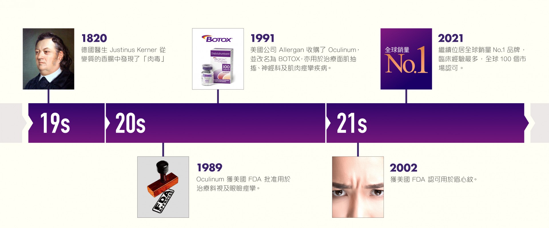 現今醫學美容療程的肉毒桿菌素,已被稀釋及高度純化,醫學界最初研究發現用於治療斜線、眼瞼及肌肉痙攣,後來在患者身上意外發現眼部皺紋消失的驚人去皺效果,引發史上醫美去皺革命,至今更廣泛用於瘦面、瘦肩、瘦小腿及腋下止汗等。