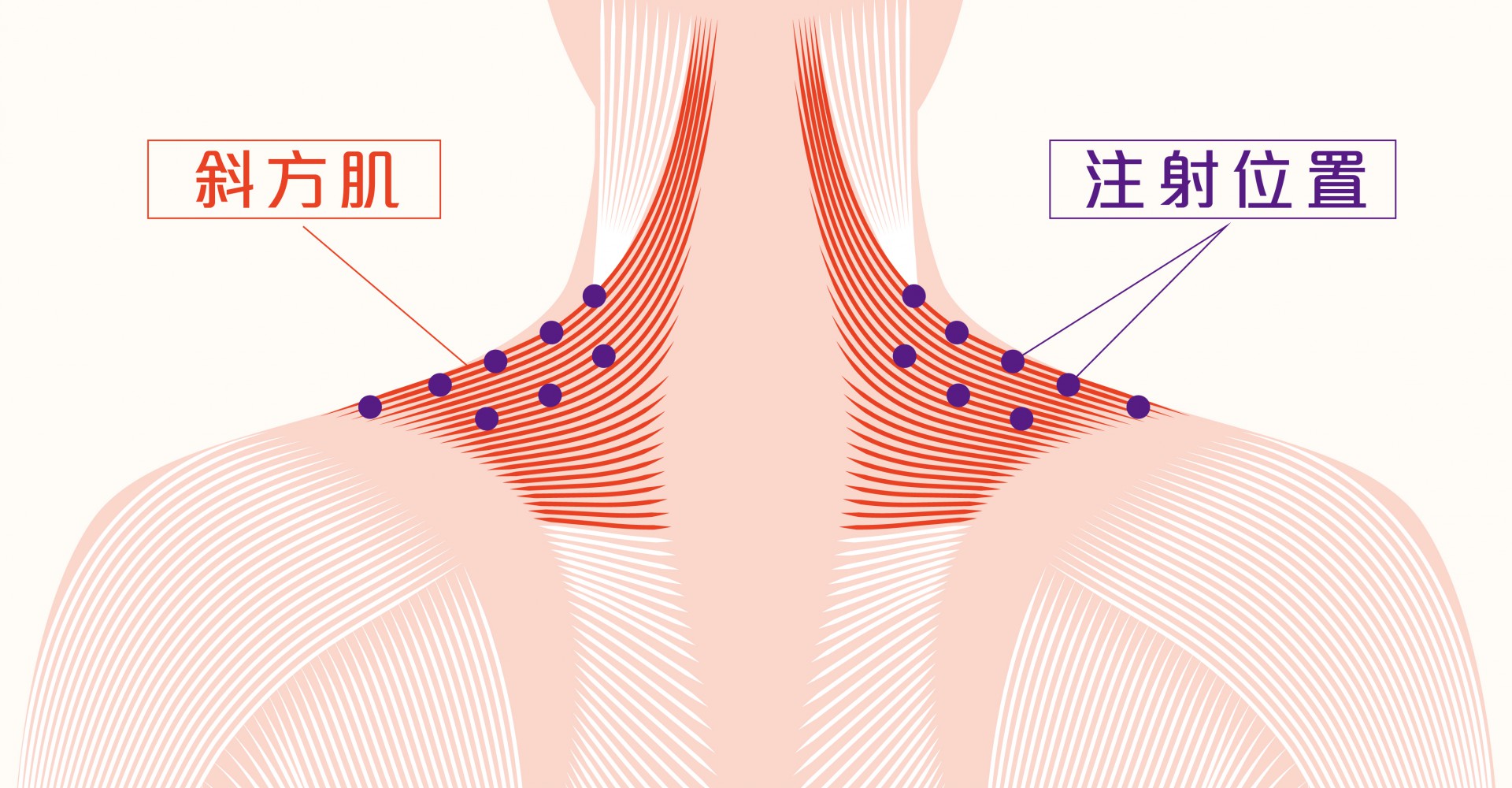 保妥適「瘦肩針」是指使用肉毒桿菌素在較發達的斜方肌位置,斜方肌位於頭部往頸部,肩膀延伸的三角位置,斜方肌發達看起來感覺魁梧強壯。透過肉毒桿菌素,能抑制神經末梢分泌乙醯膽鹼,阻止神經和肌肉的連接而舒緩斜方肌,讓肌肉達到放鬆變小的效果。當斜方肌變小,肩膊維持在放鬆的狀態,呈現自然柔和的背部線條。