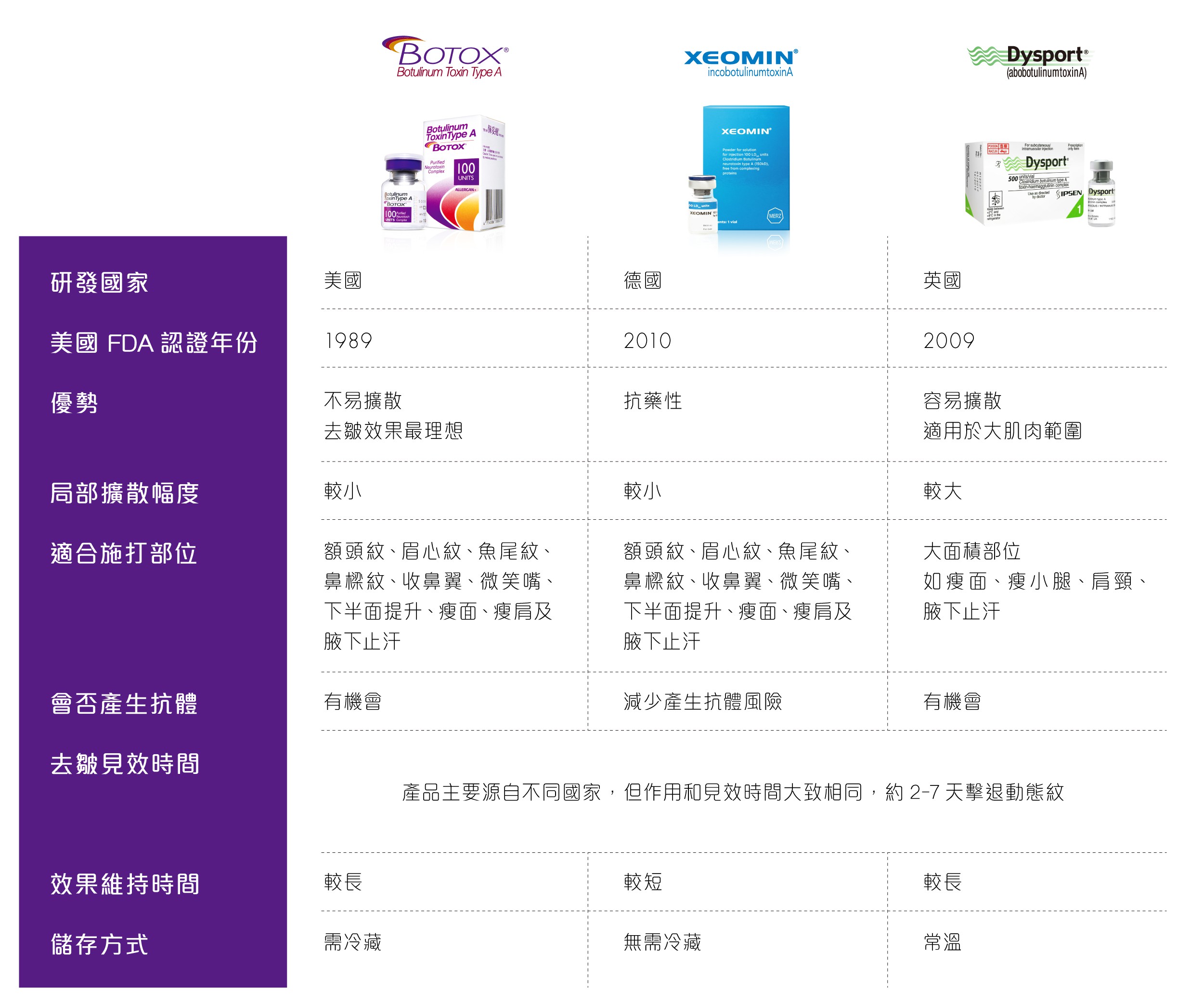隨着醫學美容發展蓬勃,目前在市面上已經發展出多個肉毒桿菌素品牌,分別在不同國家及年份推出: