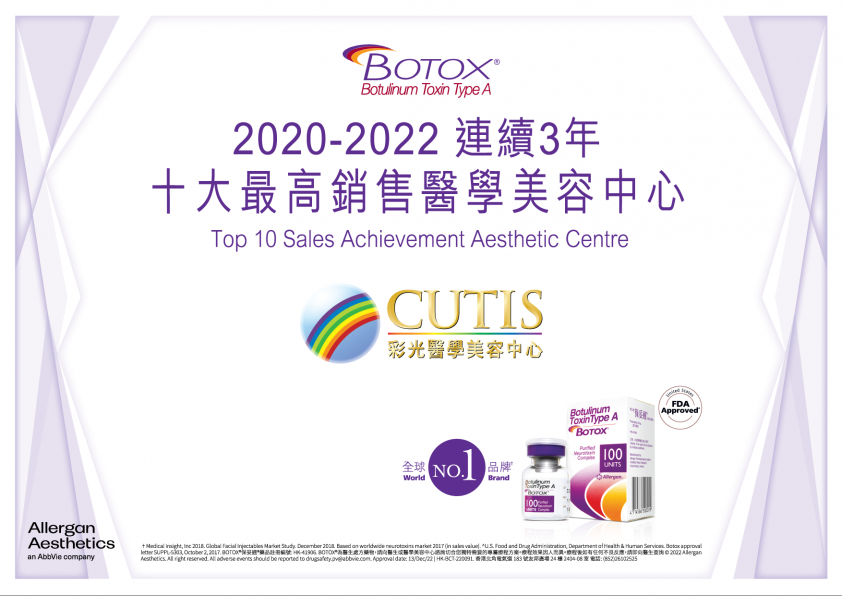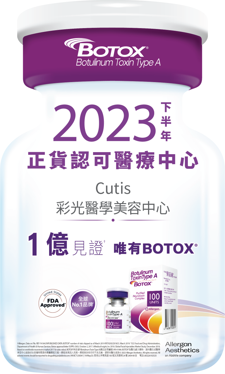 全球銷售 No.1去皺品牌,獲首個美國 FDA 認證超過 30 年。它是一種從細菌提煉出的高純度蛋白質,可用於去皺美容療程的肉毒桿菌素,能阻隔神經末梢的訊息傳遞,從而令繃緊的肌肉放鬆,快速而有效地撫平面上動態紋。現時超過 100 個市場銷售,4200 份醫學文獻及研究支持,獲首個國際級安全認受。