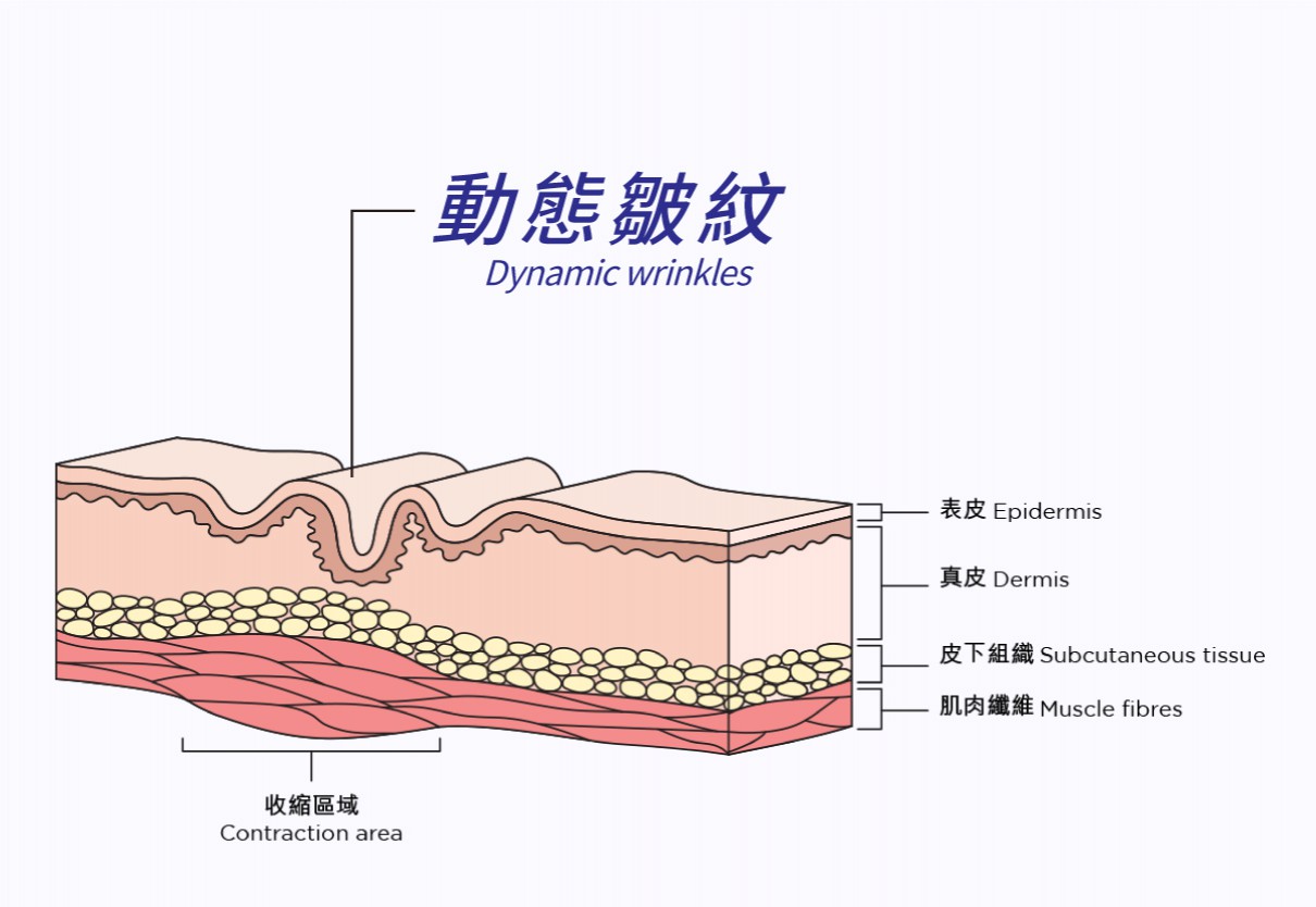 當使用肉毒桿菌素於面部肌肉時,可以阻隔神經末梢釋放乙醯膽鹼,令面部肌肉收縮能力減弱,有效放鬆導致動態紋的面部肌肉,大大減少紋路的出現,達到高效去皺效果。