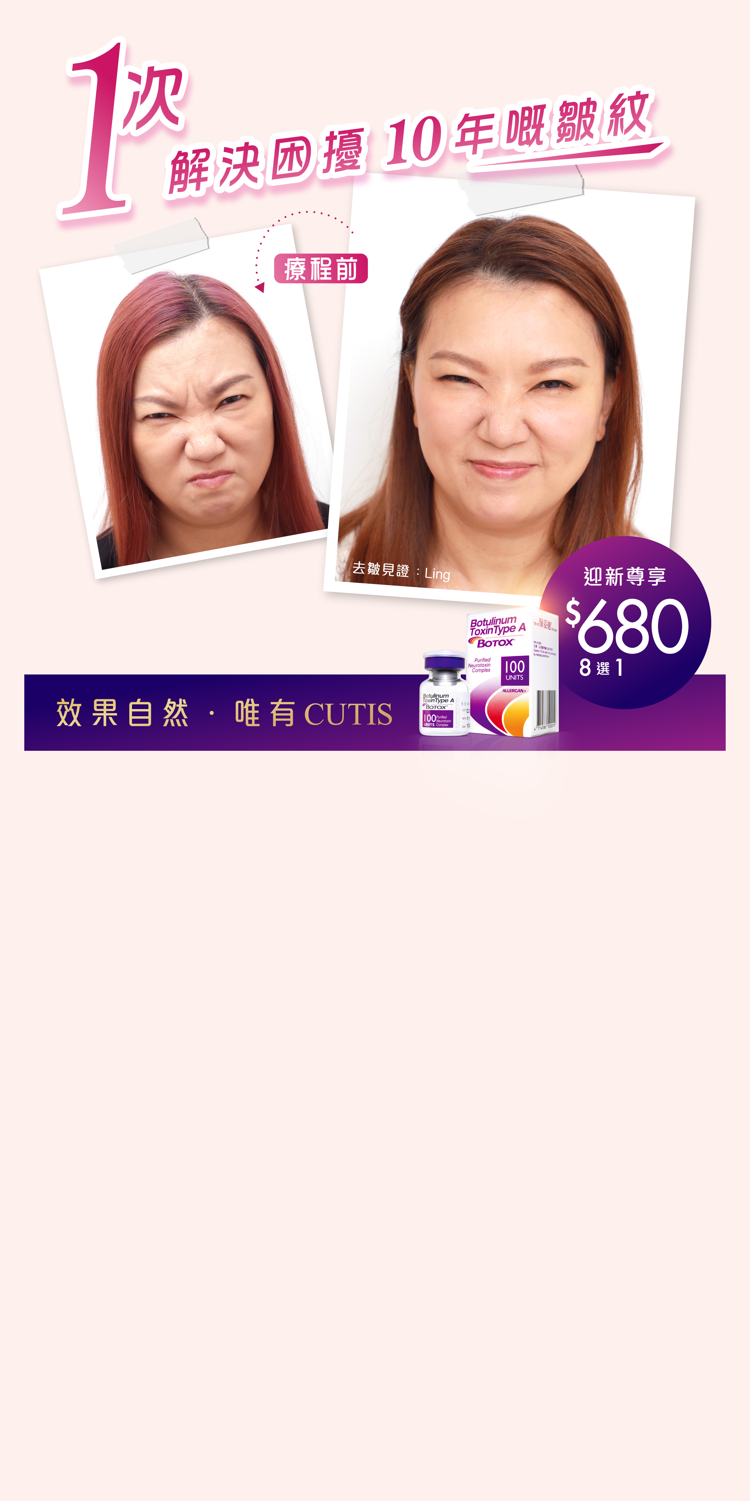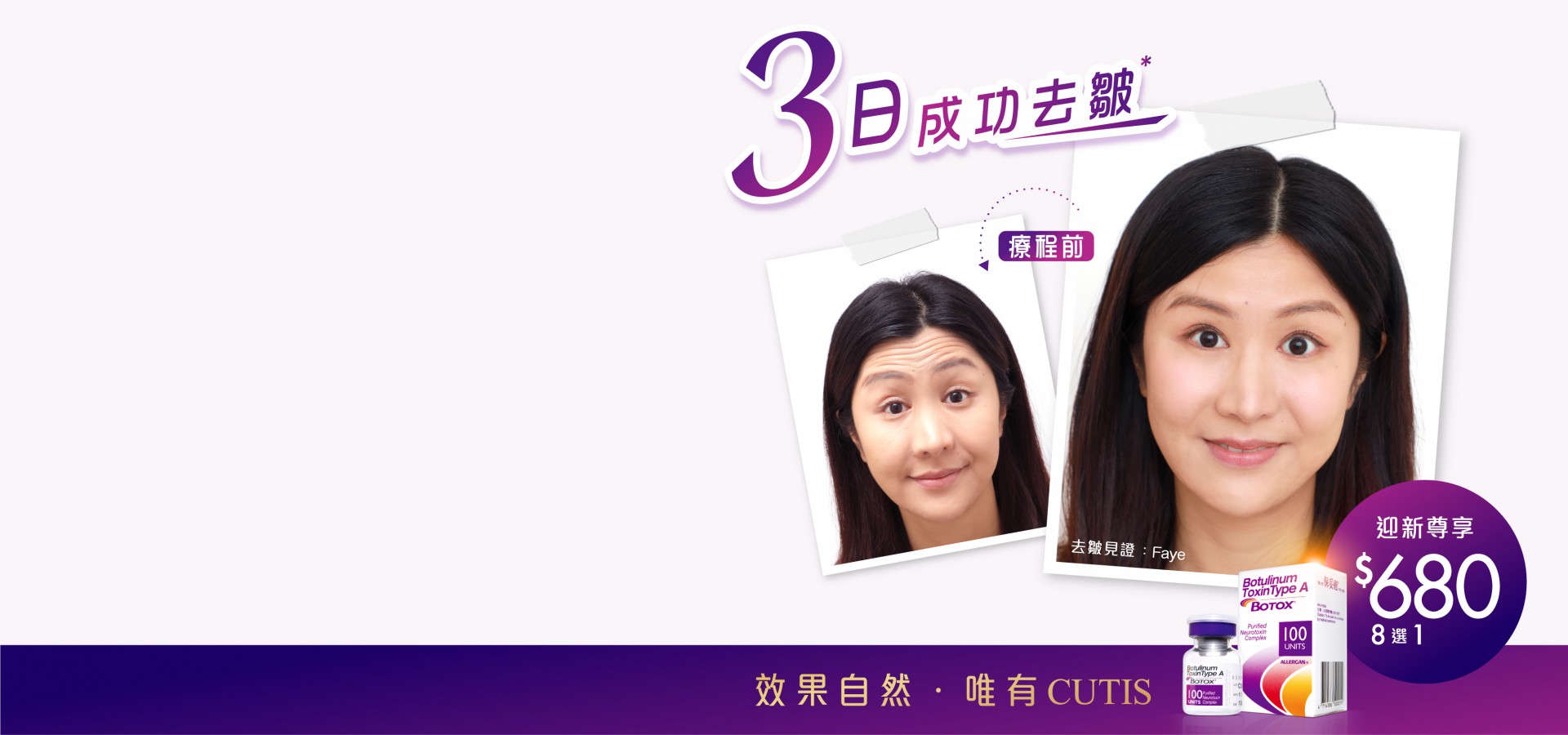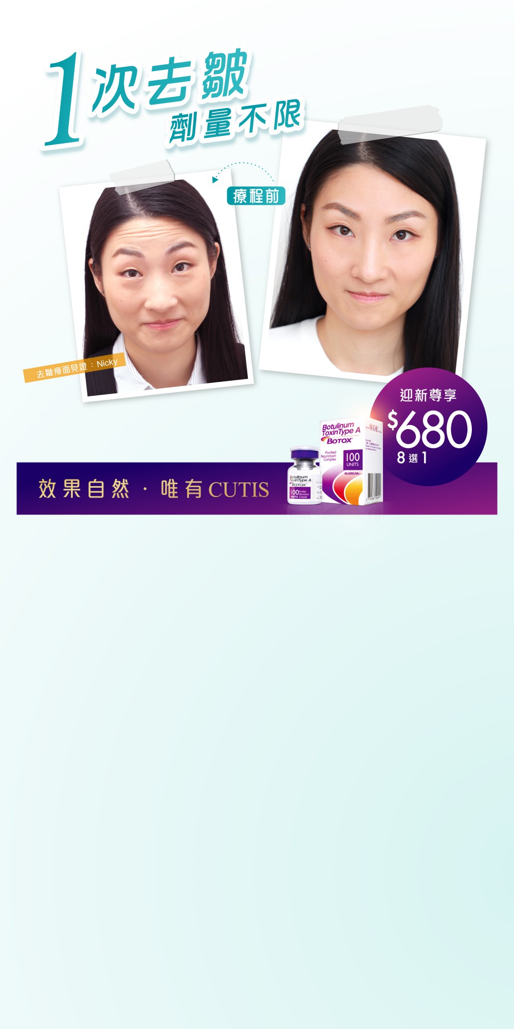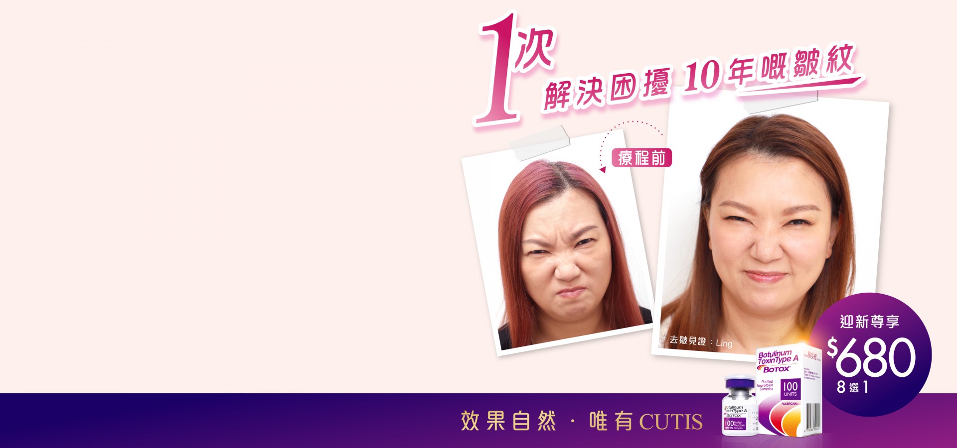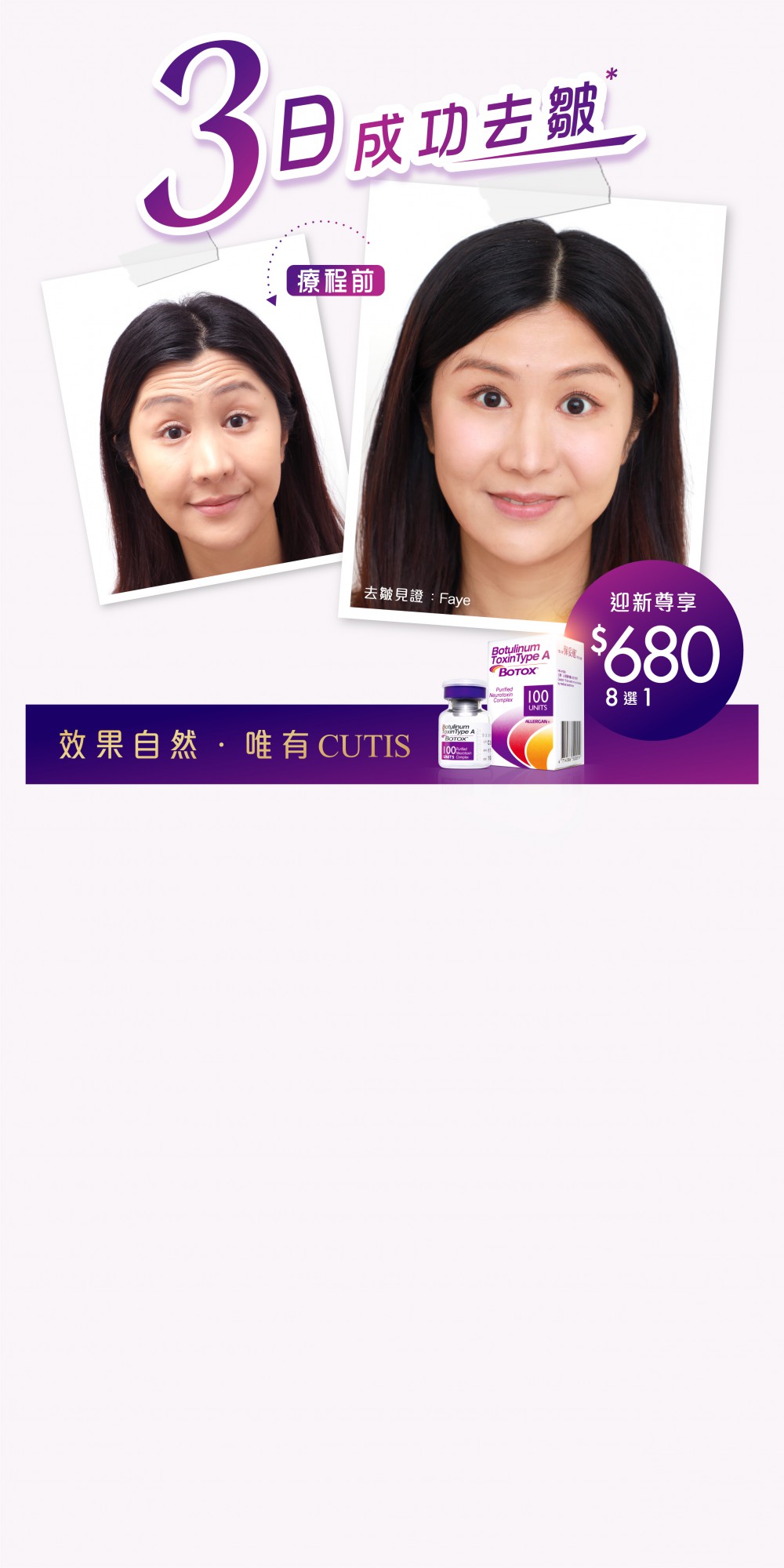 由專業人士分析你的紋路分佈,用極幼細的注射針咀,將肉毒桿菌素注射於臉上最適當的數個位置,並不會到達全身或累積於人體內。10分鐘的簡單療程,注射後2-3天內開始發揮功效*,表情紋得到明顯的改善;約第7天即有助撫平難看的表情紋。療程後不留明顯痕跡,即日可回復正常生活。