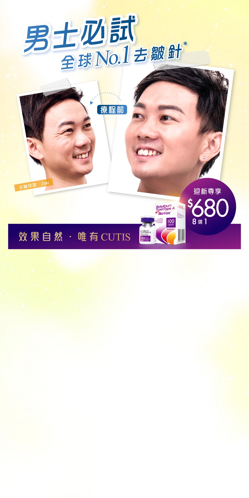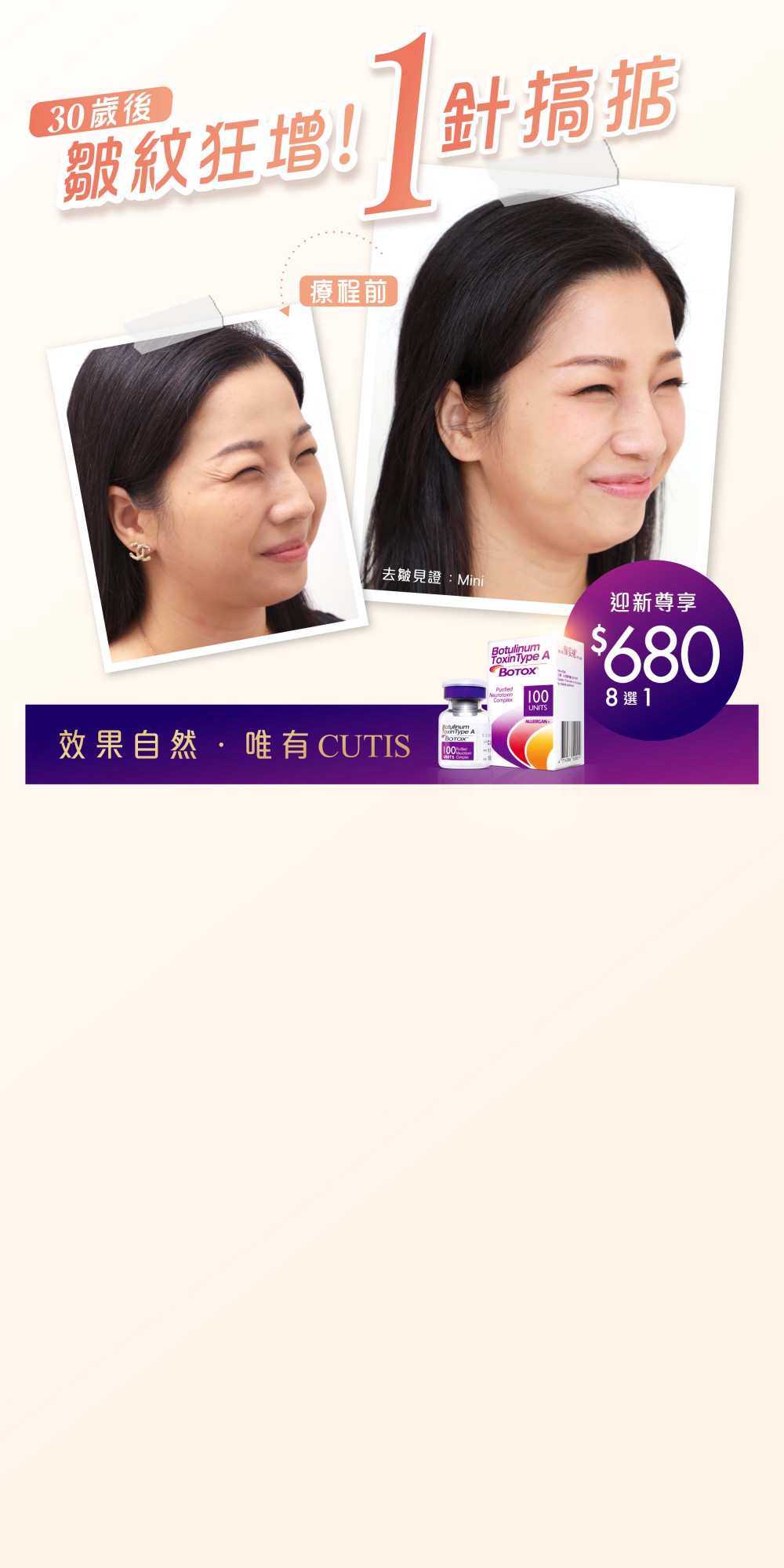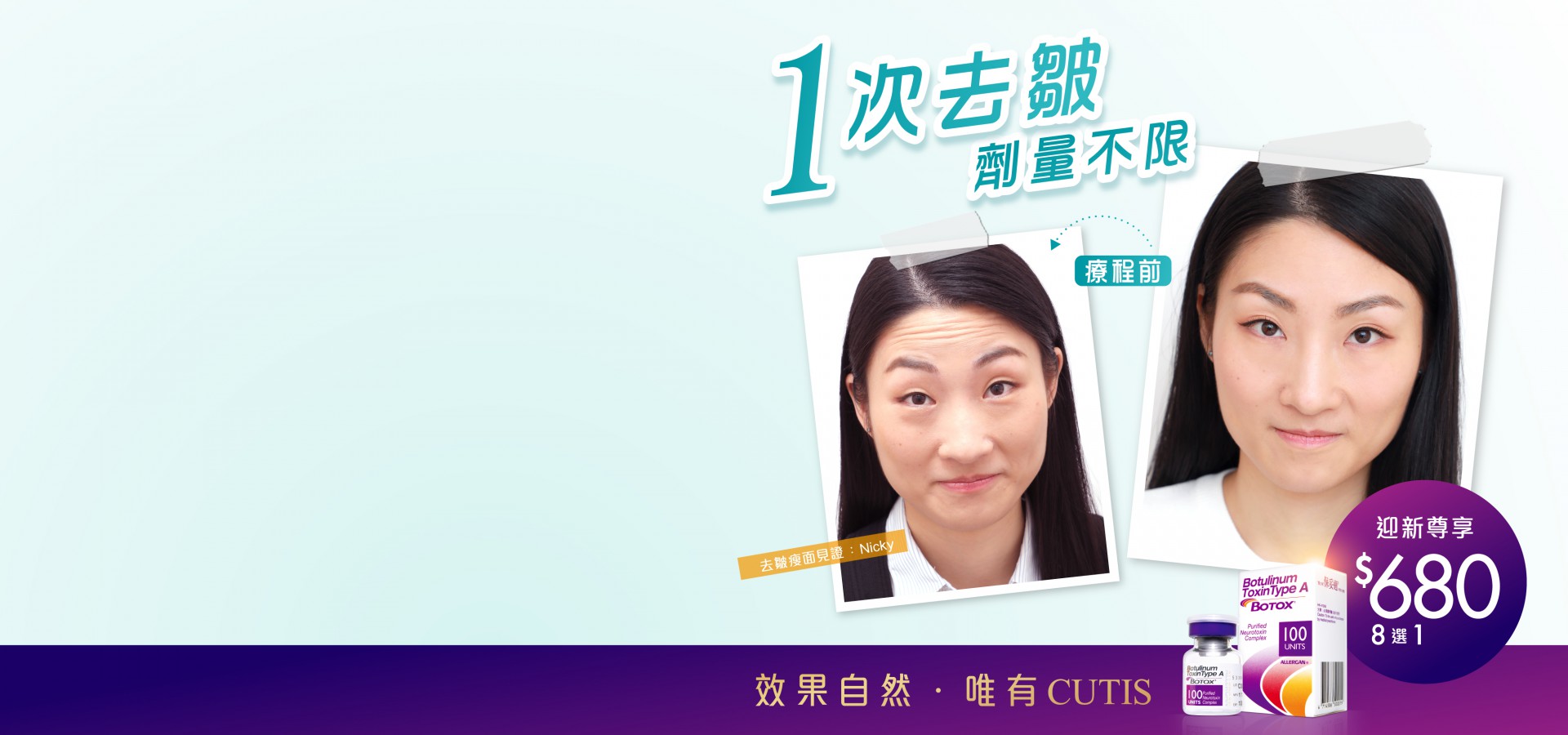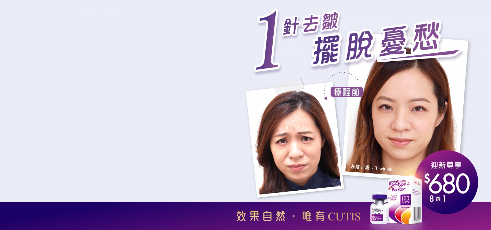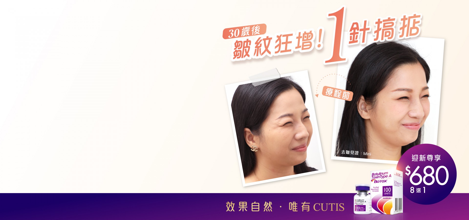 由專業人士分析你的紋路分佈,用極幼細的注射針咀,將肉毒桿菌素注射於臉上最適當的數個位置,並不會到達全身或累積於人體內。10分鐘的簡單療程,注射後2-3天內開始發揮功效*,表情紋得到明顯的改善;約第7天即有助撫平難看的表情紋。療程後不留明顯痕跡,即日可回復正常生活。